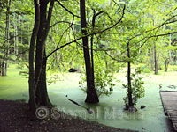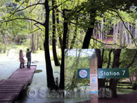 Nun sind es nur noch 600 Meter bis zum Königsstuhl und die Station 7 kommt in Sicht. Hier wird der Stelzenbaum und seine Daseinweise beschrieben. Man befindet sich an einem kleine Sumpf, in welchem zahlreiche Schwarzerlen im Wasser stehen. Am Stammfuß der dunkelrindigen Erlen sind Besonderheiten zu entdecken. Sie besitzen korallenartige verzweigte Wurzelknöllchen und haben Stelzwurzeln.